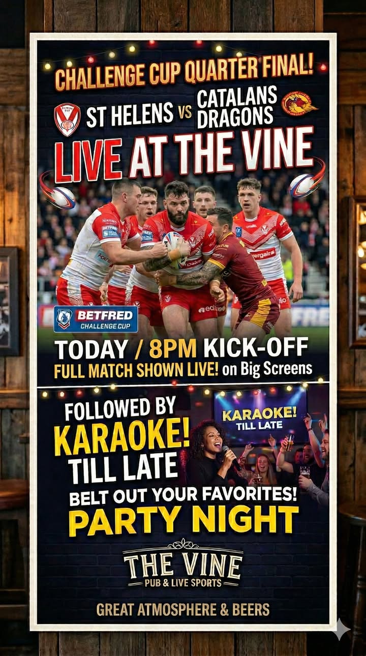 The Vine is a beloved pub situated at the heart of Thatto Heath in St. Helens. We offer great value for money and are your go-to place for all things sport and big weekend entertainment. Enjoy pool tables, dart boards, and cheer on your favourite football & rugby league teams with the perfect pint in hand! It's the perfect space for everyone to enjoy.